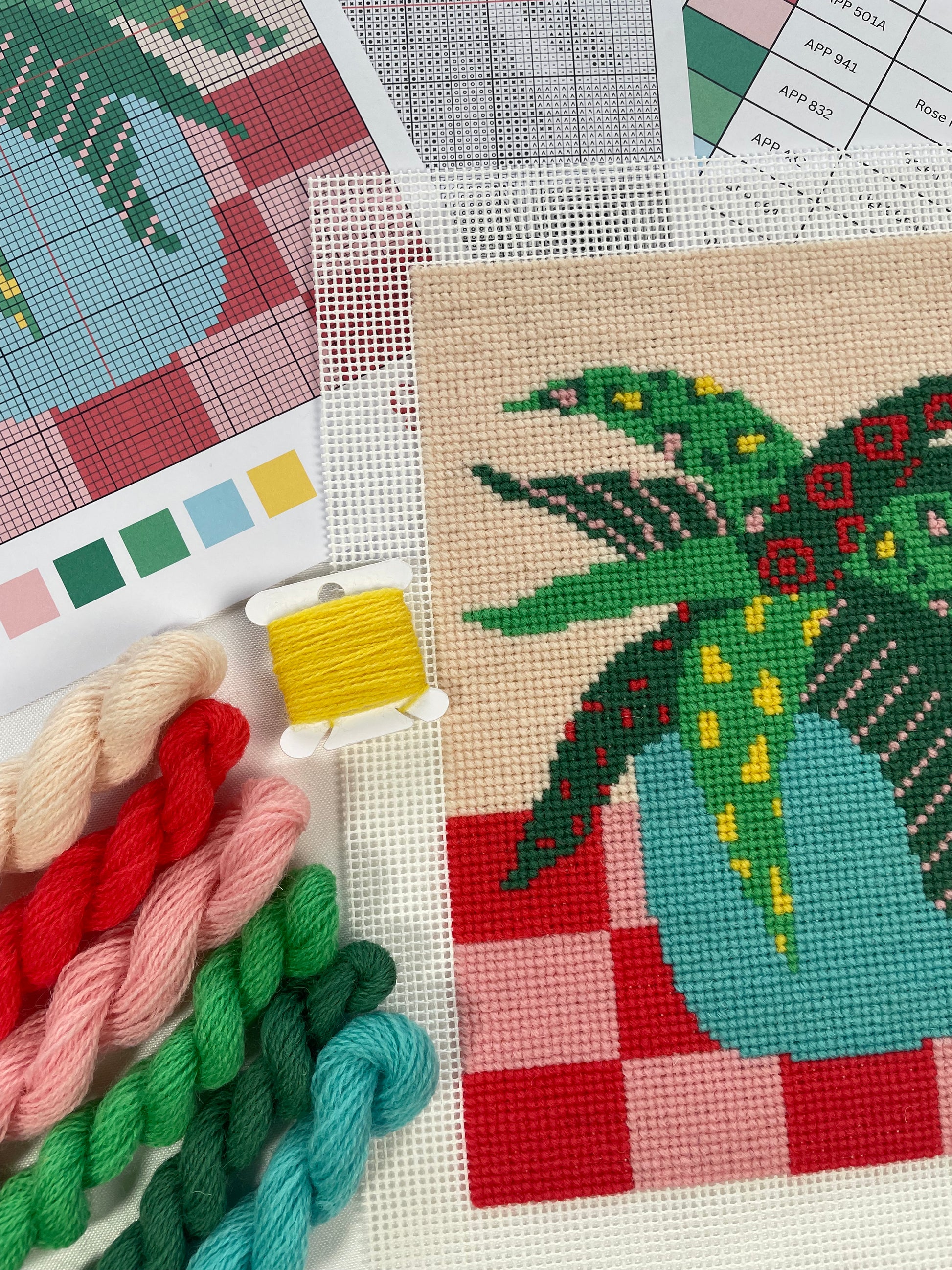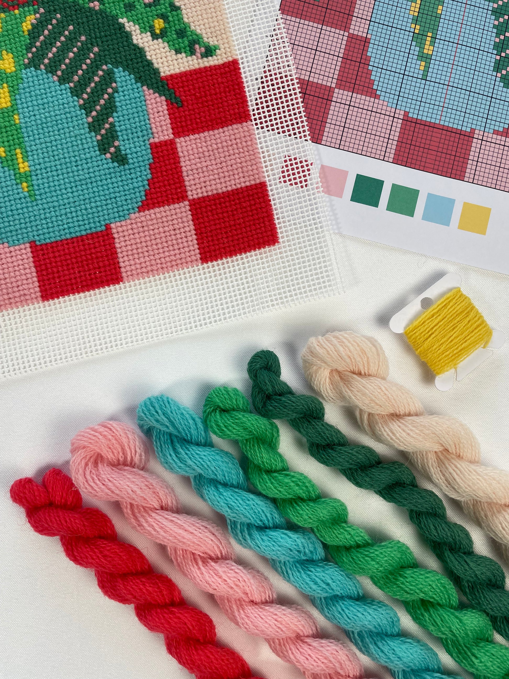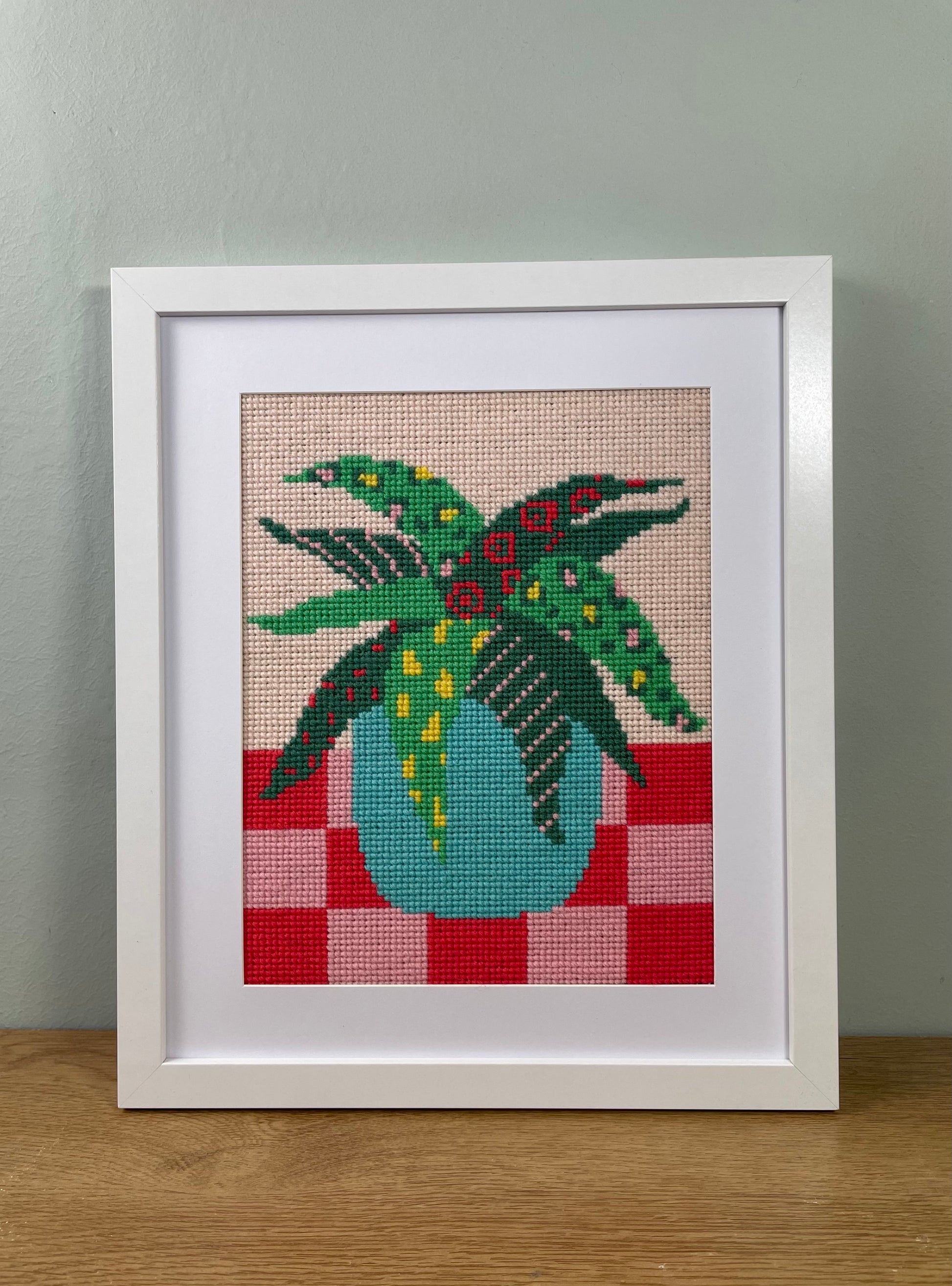 Brighten up your crafting time with this colourful modern cross stitch kit from Calla Rae Studio. Featuring a stylish plant with patterned leaves in a bold blue pot on a vibrant pink and red chequered table, this DIY embroidery kit is perfect for both beginners and experienced stitchers looking for a relaxing and rewarding project.